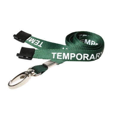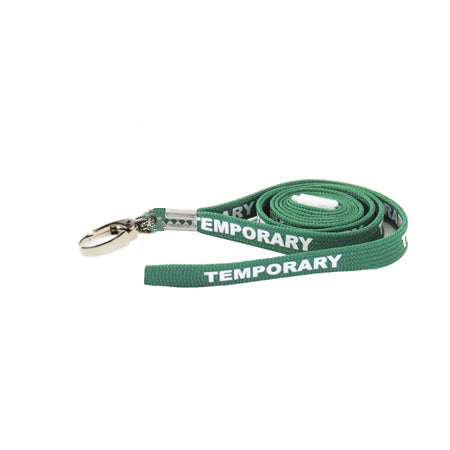 Green Lanyard displaying 'TEMPORARY'. Create a safe working environment ensuring everyone on site can identify a temporary staff member as being authorized to be on site at a glance and their ID badge is displayed. The breakaway provides a safety feature allowing the lanyard to snap off if the cord becomes trapped or tangled to prevent injury to the wearer. The lanyard has a metal hook attachment for use with ID holders. This premium lanyard is not a basic material. It is made of woven polyester that is comfortable and desirable to wear.